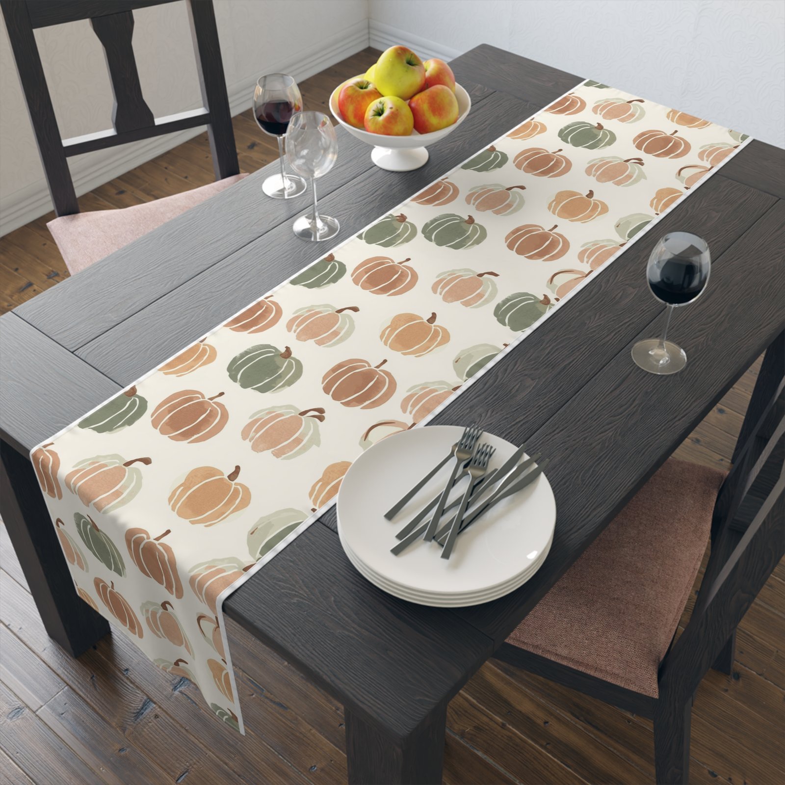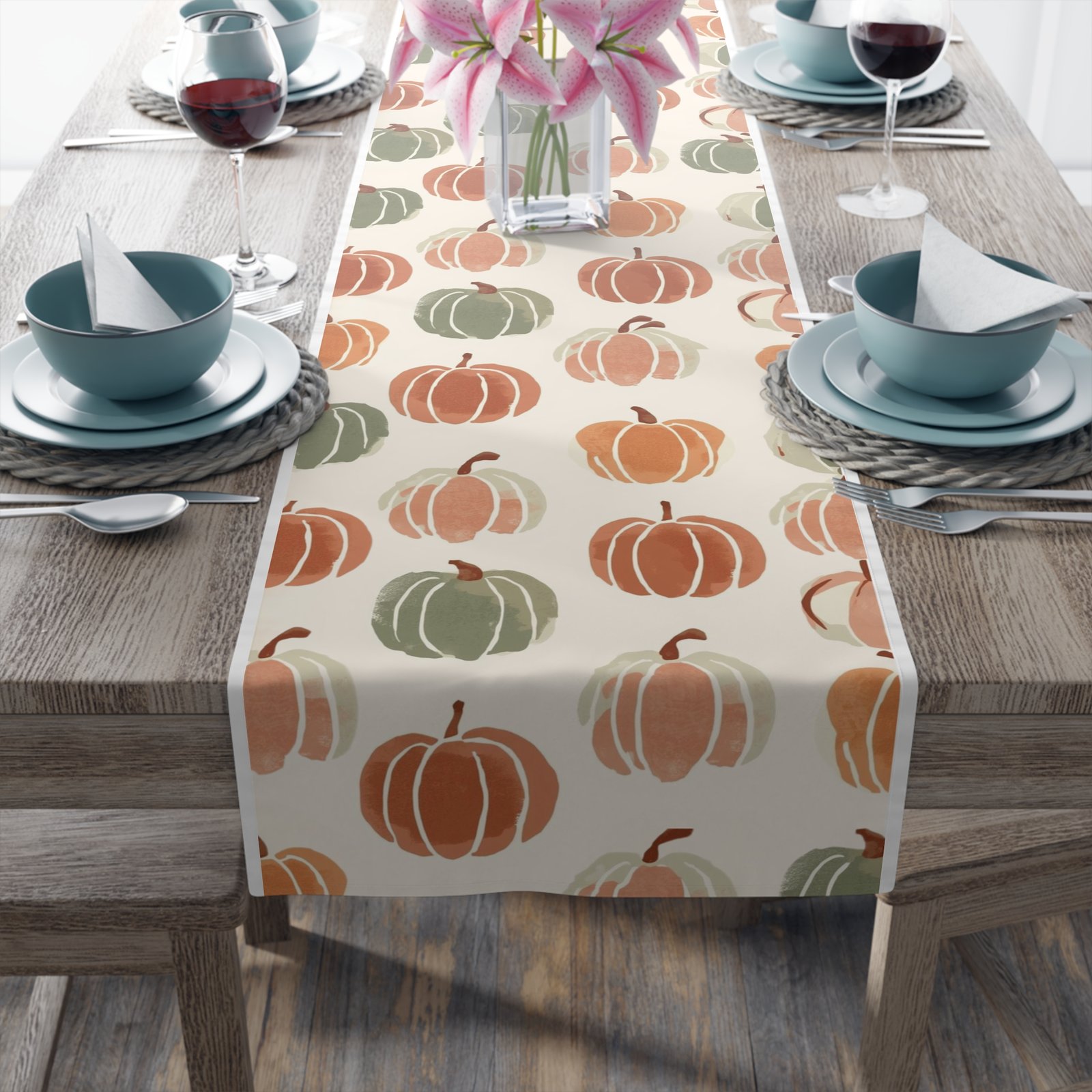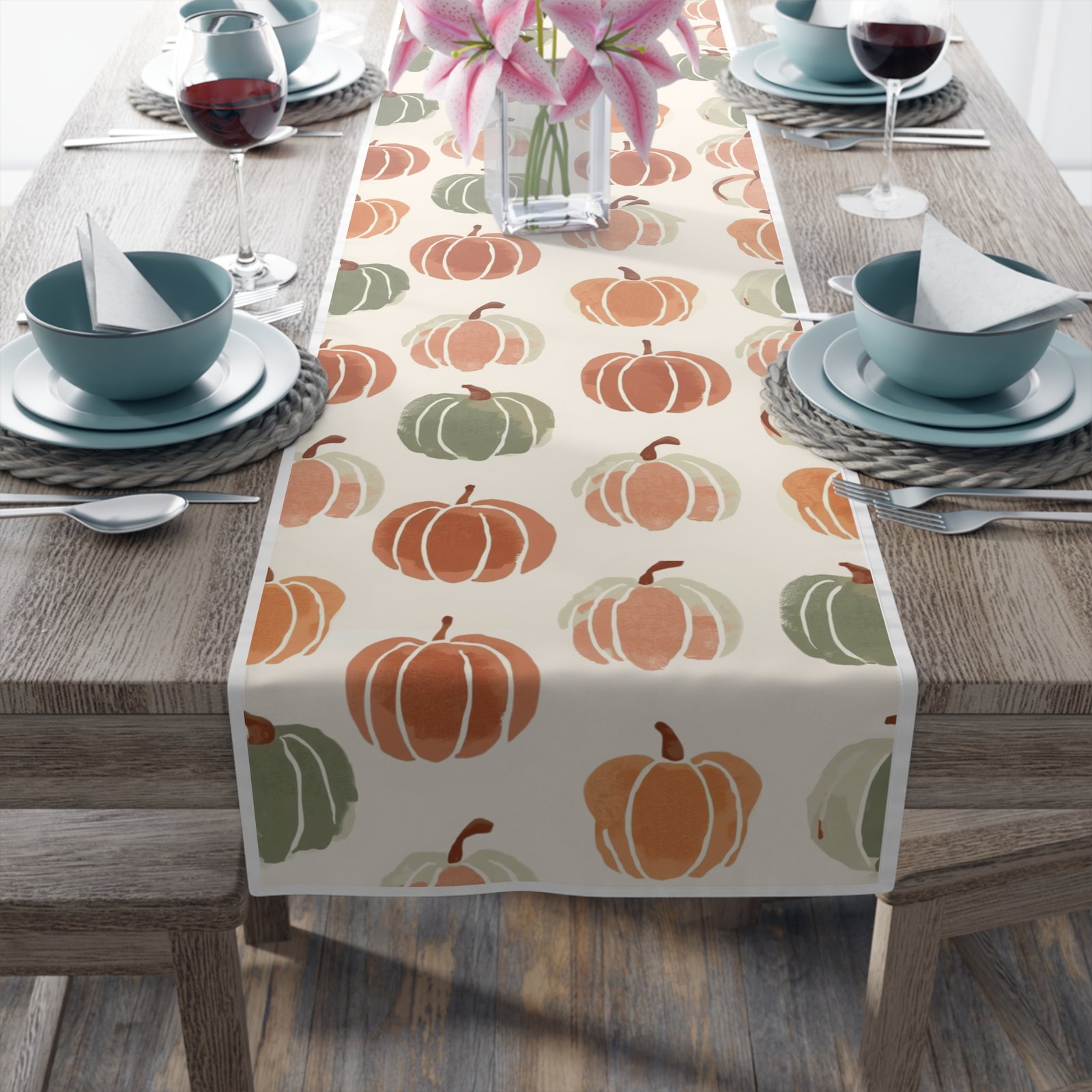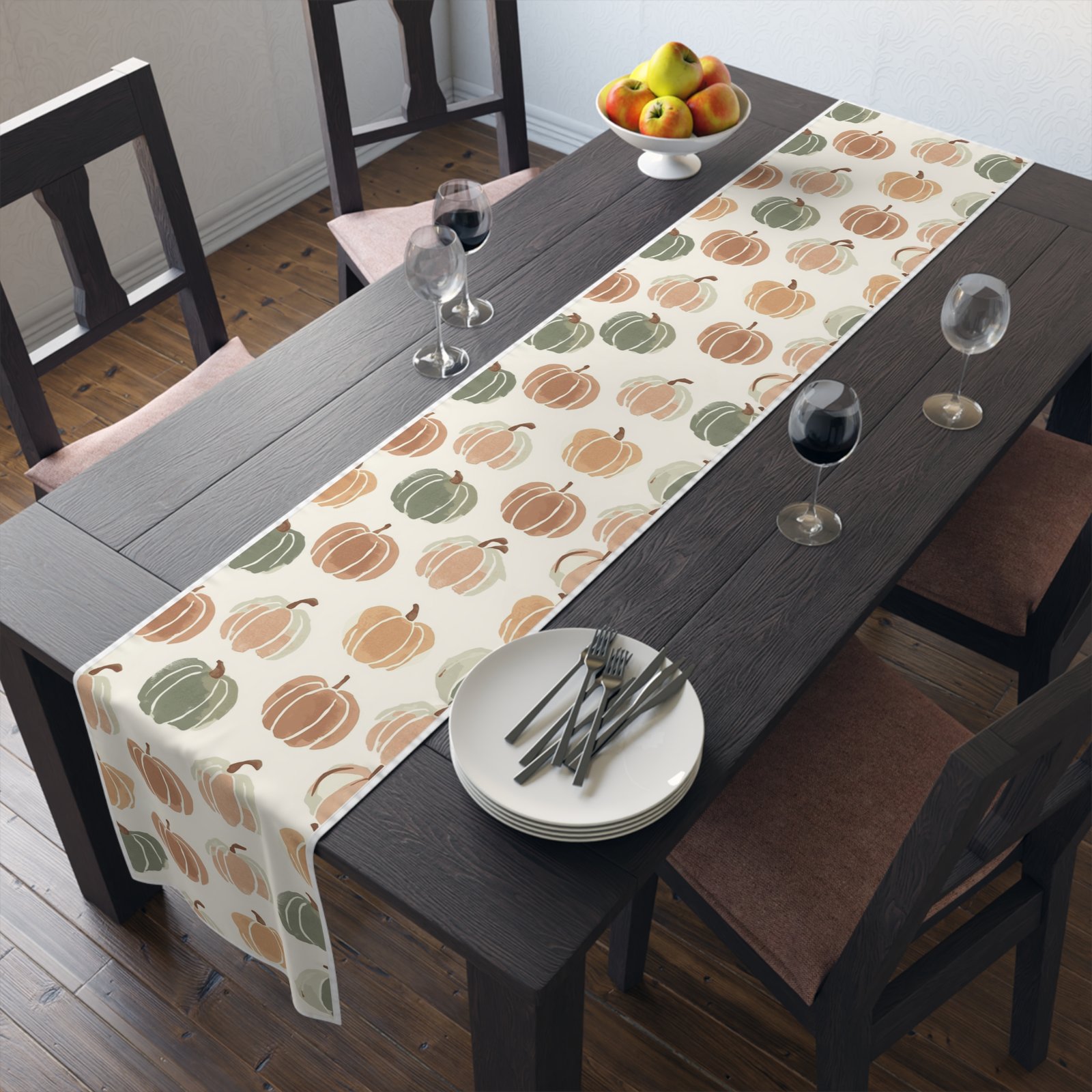 Soft, autumnal charm in a long, elegant runner — this table runner brings hand-painted pumpkin motifs and warm neutral tones to your seasonal table. Lightweight and drapey, it layers easily over wood, linen, or a neutral tablecloth to add texture and gentle color without shouting. Choose durable polyester with vivid sublimation printing for bright, long-lasting color and quick-dry performance, or opt for cotton twill with a slightly muted, classic finish and visible hem stitching for a homespun look. Available in two lengths to suit a cozy breakfast table or a longer dining setup. One-sided print and neatly hemmed edges ensure a tidy, finished appearance every time.