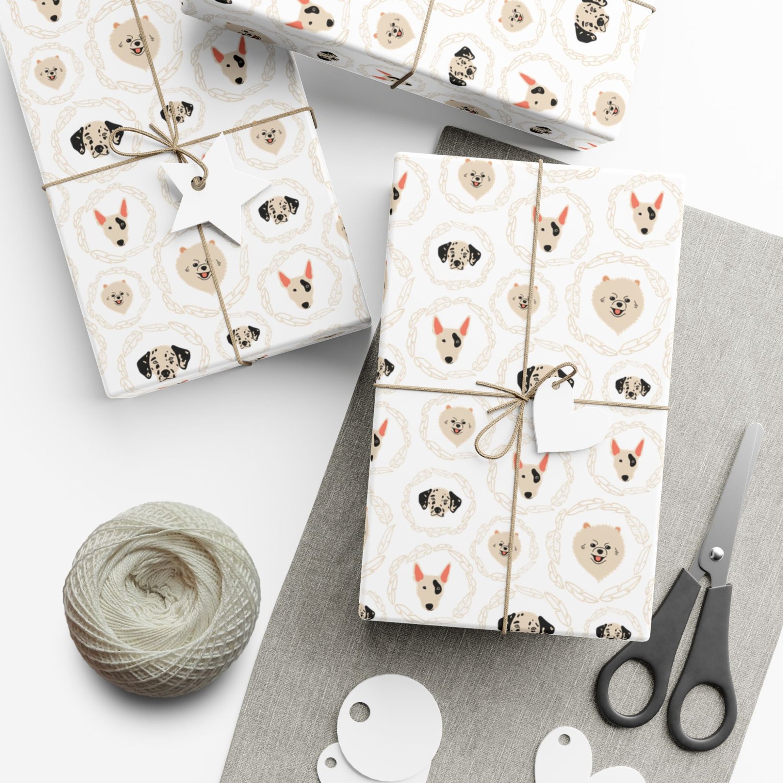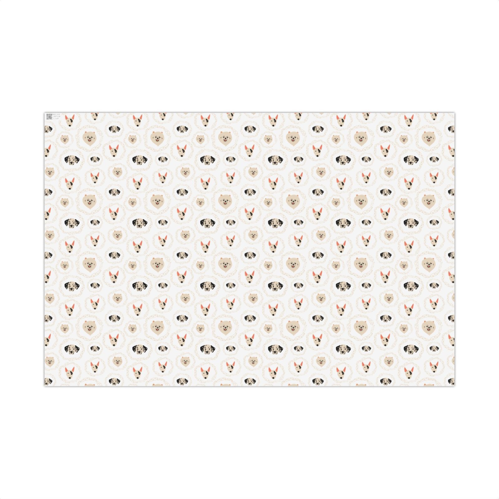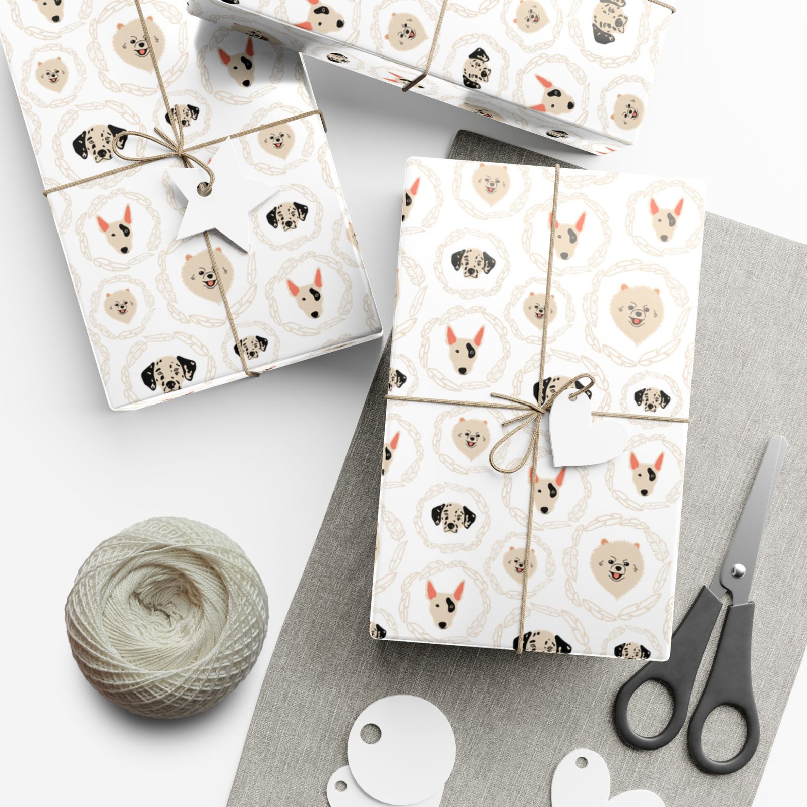 Quiet, cheerful, and made to delight — this gift wrap brings a warm, handmade feeling to every present. Soft watercolor dog faces repeat across a creamy background, giving packages an easygoing, sweet personality that suits cozy gatherings and thoughtful surprises. The sheets handle well: they fold cleanly without cracking, shrug off small scuffs, and hold their color through satin or matte finishes. Use the smaller sheets for stocking-sized treats, or the larger cuts for bulkier boxes. Printed with water-based GreenGuard-certified inks and fully recyclable, these wraps add charm without extra waste — the kind of detail friends notice and smile about.
