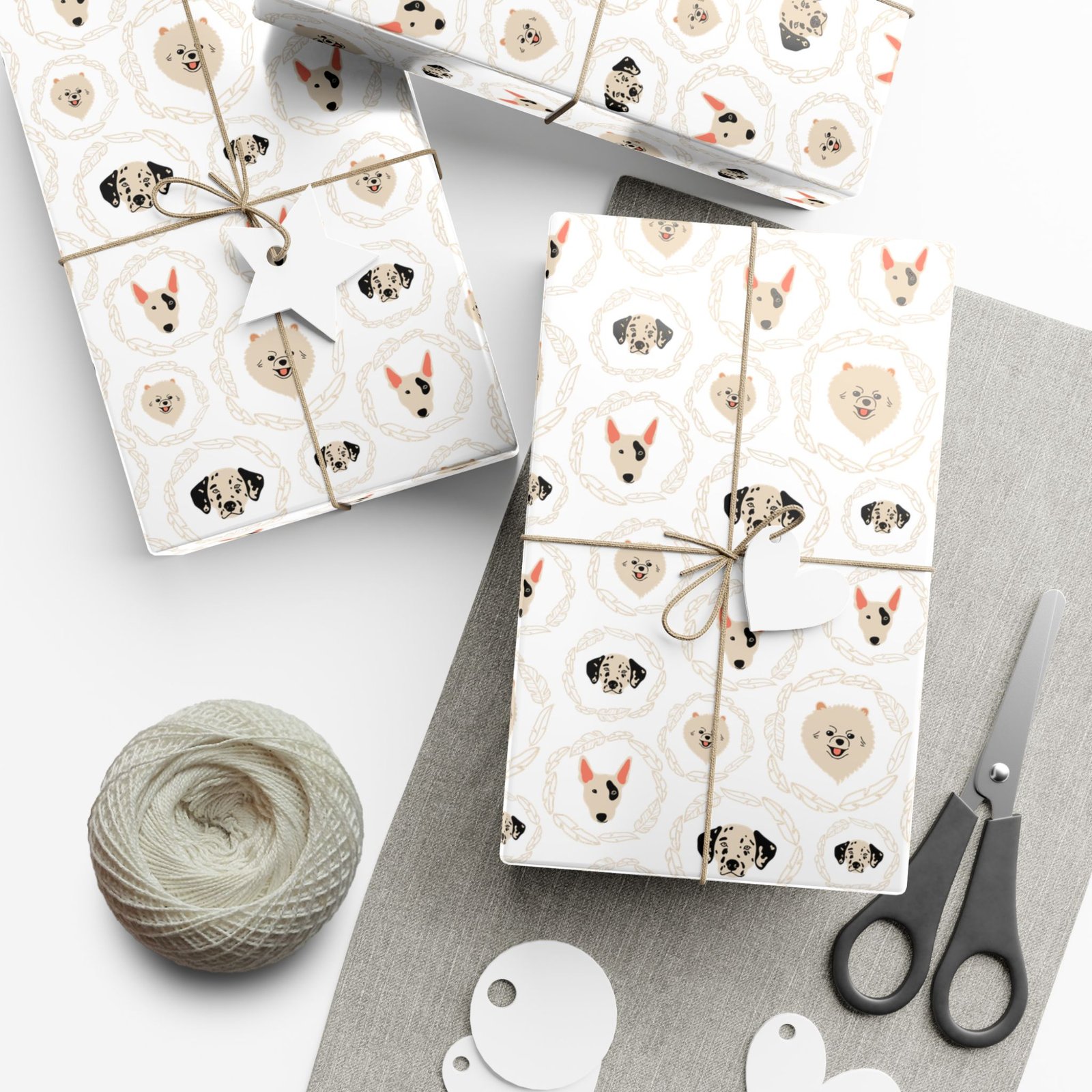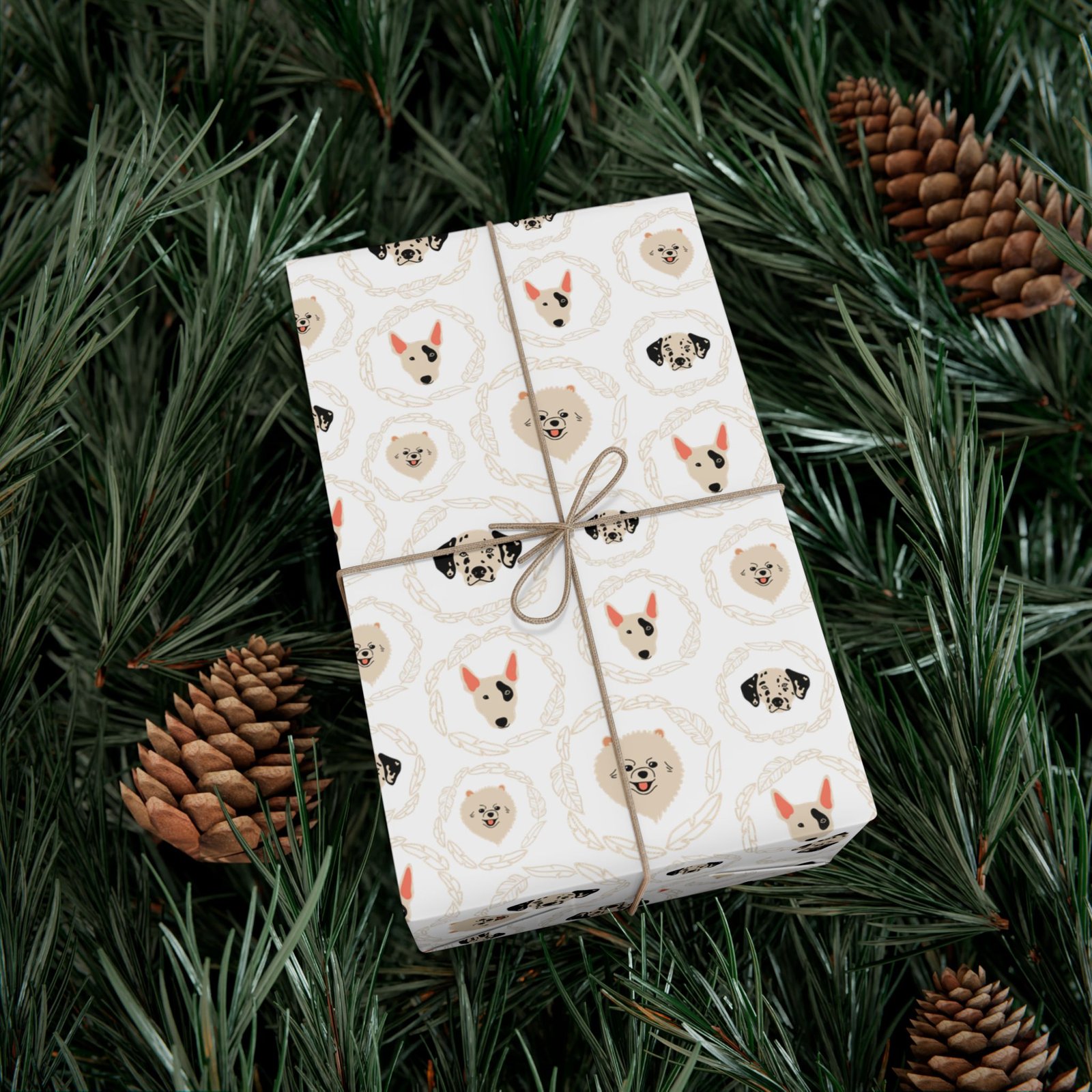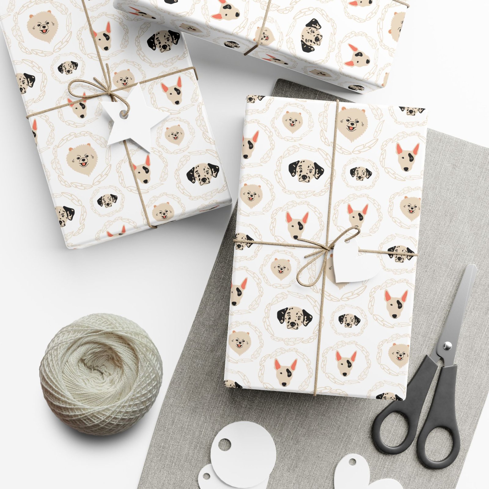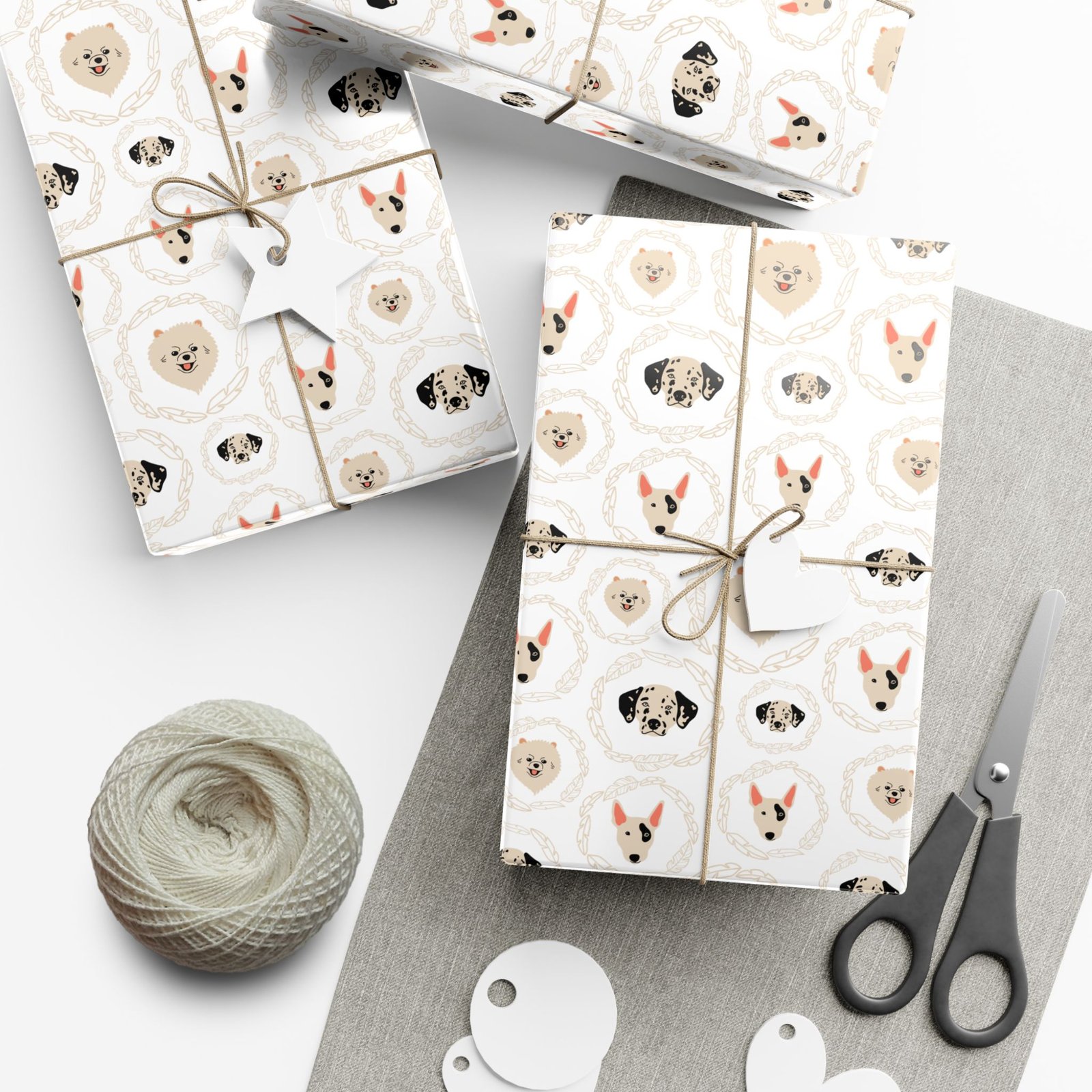 Quiet, cheerful, and made to delight — this gift wrap brings a warm, handmade feeling to every present. Soft watercolor dog faces repeat across a creamy background, giving packages an easygoing, sweet personality that suits cozy gatherings and thoughtful surprises. The sheets handle well: they fold cleanly without cracking, shrug off small scuffs, and hold their color through satin or matte finishes. Use the smaller sheets for stocking-sized treats, or the larger cuts for bulkier boxes. Printed with water-based GreenGuard-certified inks and fully recyclable, these wraps add charm without extra waste — the kind of detail friends notice and smile about.